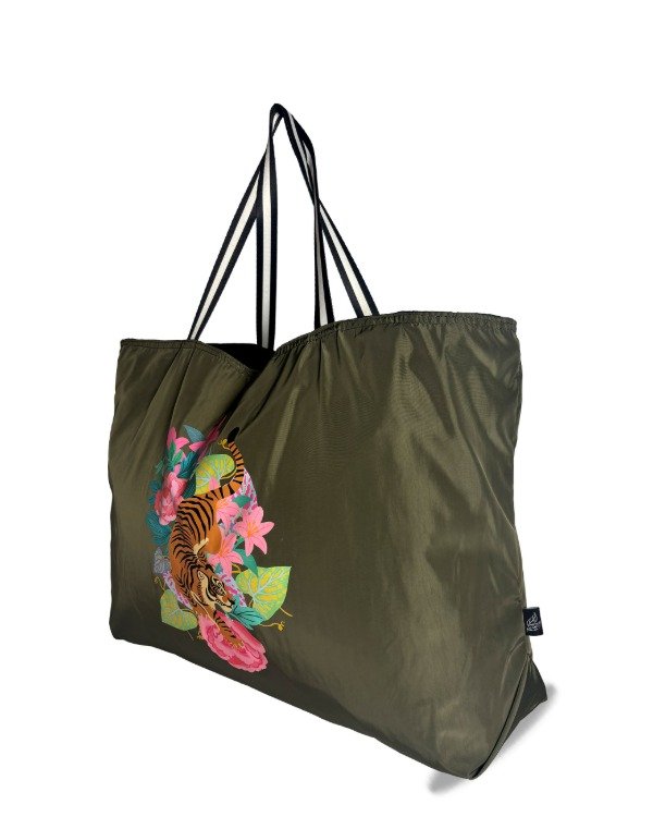 Maxi tote, confeccionado en sire con estampa y sylver impermeable.