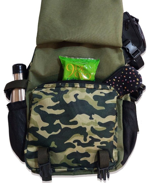 Bolsillo frontal con cierre relampago y tapa con bolsillo con cierre y broches tip top.